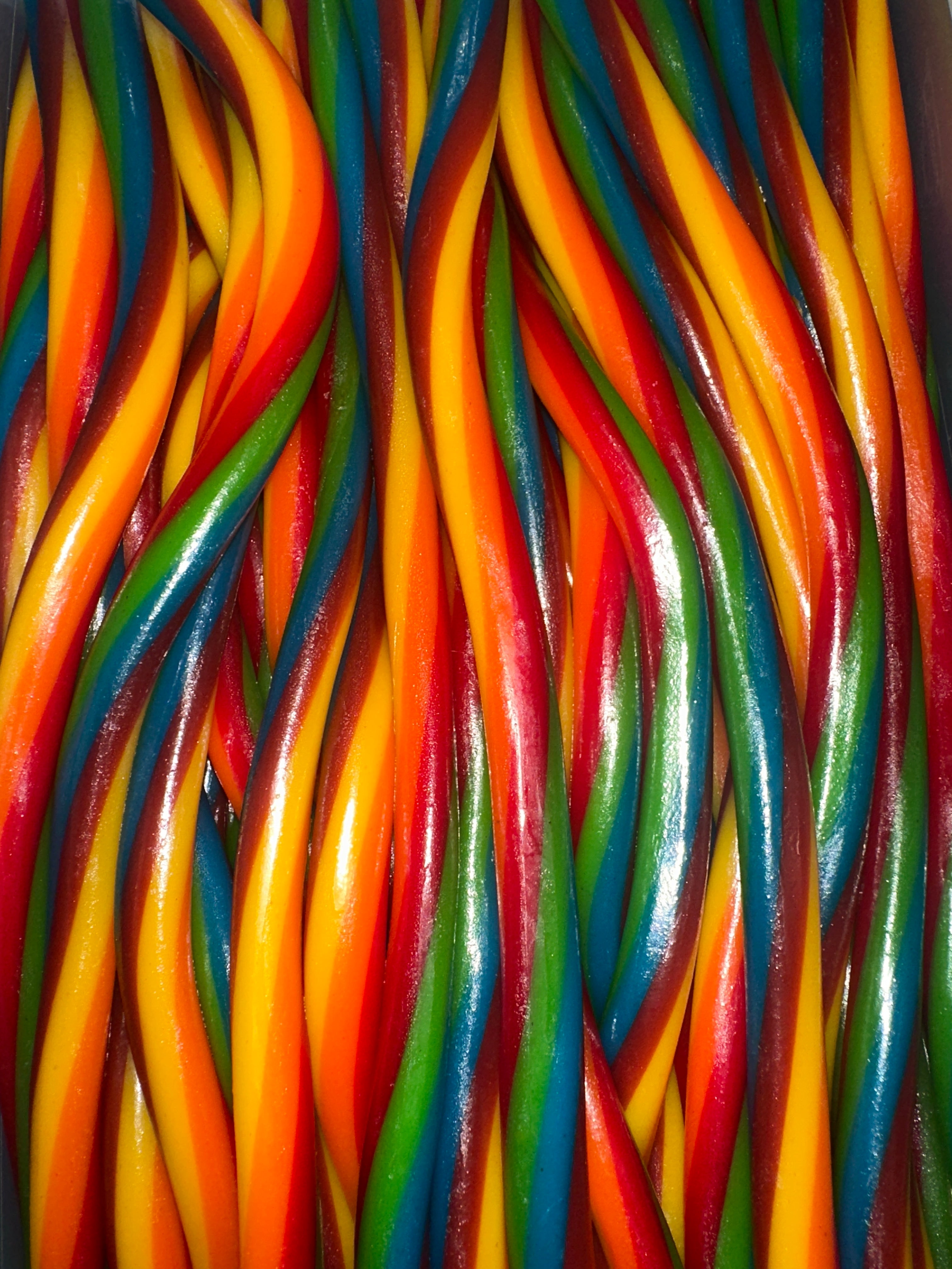 fructose ; farine de BLÉ ; eau ; graisse végétale (coco) ; acidifiants : E330, E296 ; dextrose, correcteurs d'acidité : E350; émulsifiant E471 ; amidon de BLÉ ; graisse végétale, arômes ; conservateurs E202 ; colorants : E102, E133, E341, E122, E516, E129.