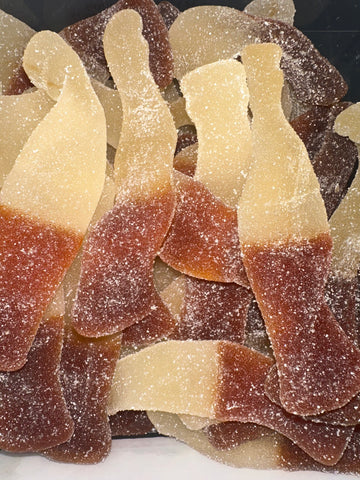 Ingrédients. (F) CONFISERIE GÉLIFIÉE GOÛT COLA / Ingrédients: sirop de glucose; sucre; gélatine; dextrose; acidifiant: acide citrique; sirop de caramel; arôme; huile de tournesol; agent d'enrobage: cire d'abeille blanche et jaune. Tenir à l'abri de la chaleur et de l'humidité.