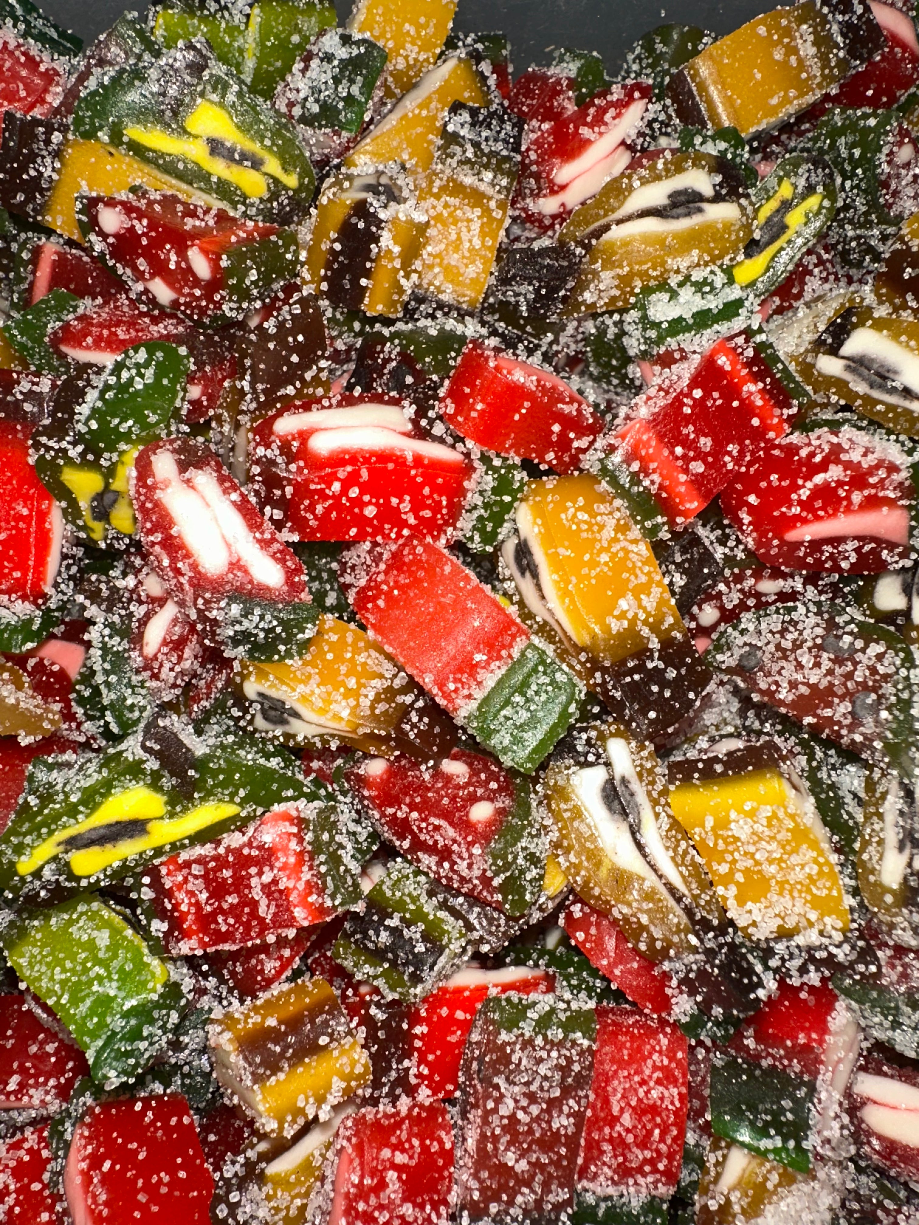 Sucre, sirop de glucose et de fructose, farine de blé (gluten), amidon, gélatine, graisse végétale (palme, coco), huile végétale (palme, coco), acidifiants (E270, E296, E330), arômes, correcteur d'acidité (E325, E331), sel, émulsifiant (E471), humectant (E422), colorants: E102, E129, E133, E150d.