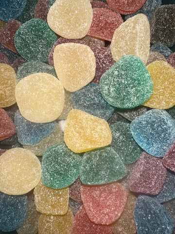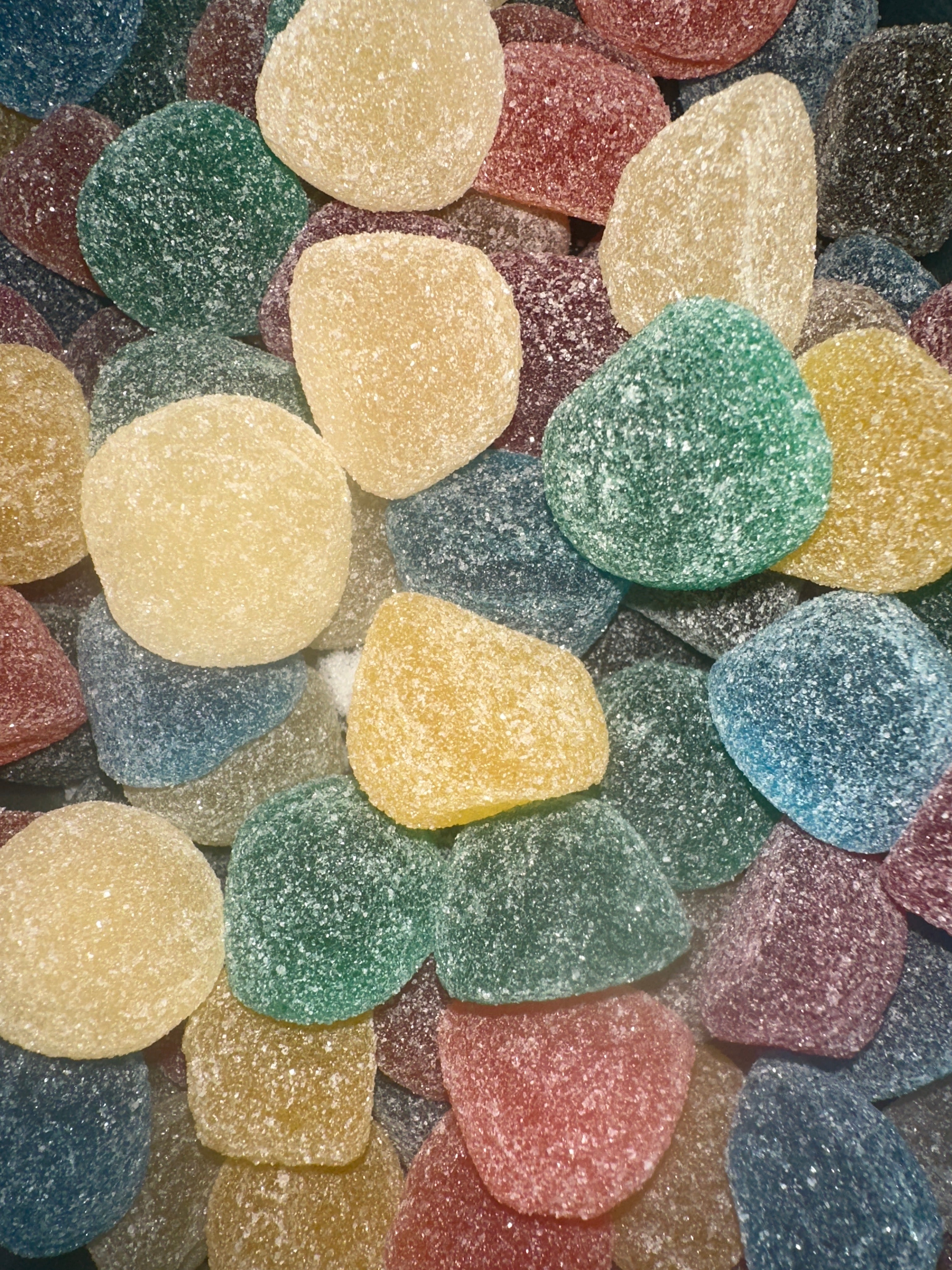 Ingrédients: sucre; sirop de glucose; amidon; acidifiants: acide citrique, acide malique; correcteurs d'acidité: citrate monosodique, malate acide de sodium; arôme; concentré de spiruline; colorants: curcumine, charbon végétal, anthocyanes; agent d'enrobage: cire de carnauba.