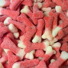 Ingrédients : Sirop de glucose, sucre, eau, gélatine de boeuf halal, amidon modifié de pomme de terre, acidifiants : E330, E270, E296, arômes, agent d'enrobage : cire de carnauba, colorants : E163, E129, E160a.