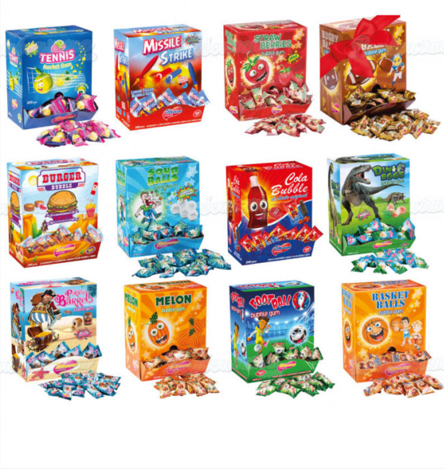 Sucre, gomme de base, sirop de glucose, dextrose, arômes, humectant (glycérol), émulsifiant (lécithine de soja), régulateurs d'acidités (acide citrique, acide malique), agents d'enrobage (cire de carnauba E903, cire d'abeille E901, shellac E904), stabilisateur (gomme arabique E414), pectin, couleurs (voir le timbre), antioxydant (BHT E321) halal