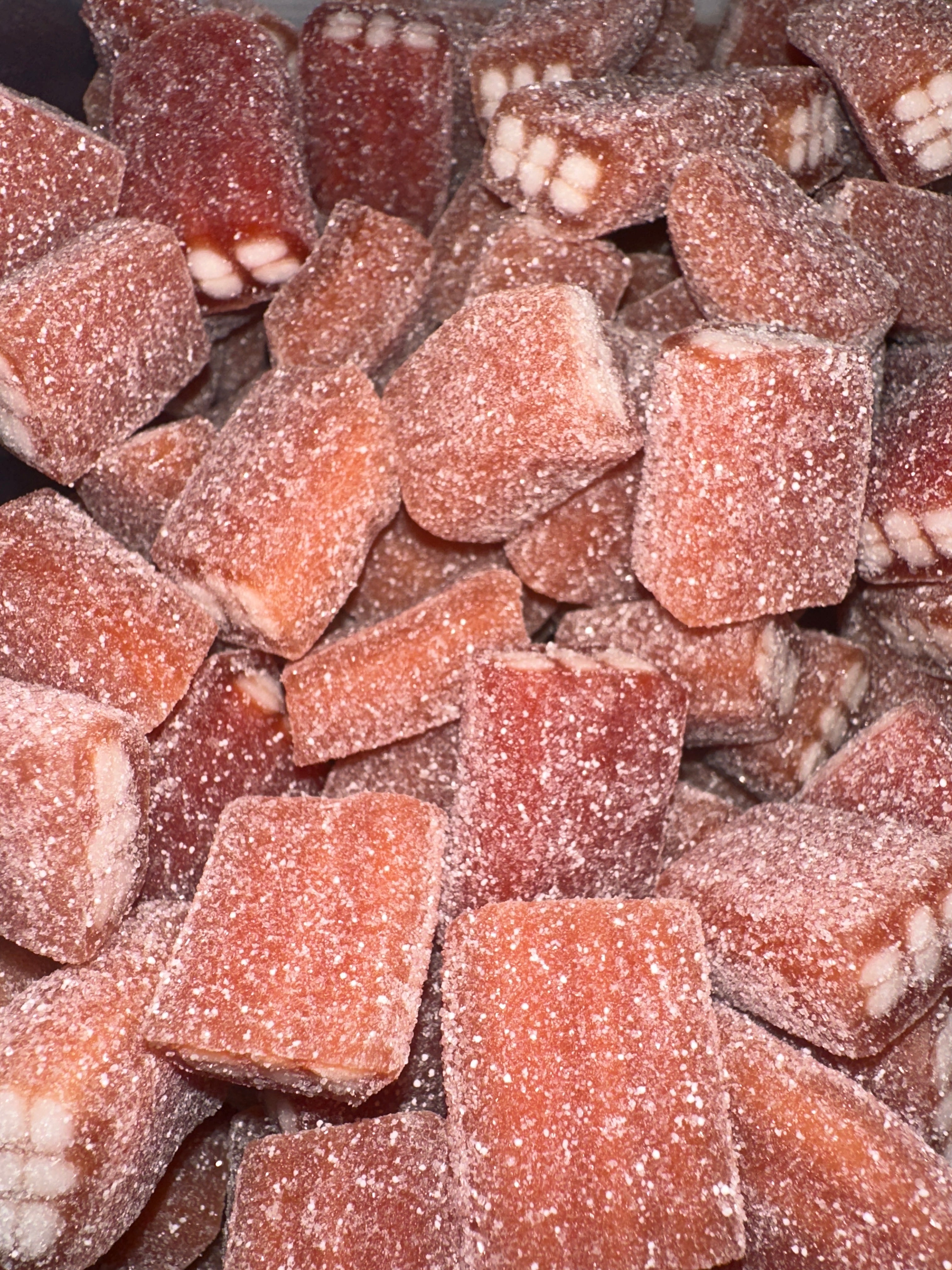 sirop de glucose-fructose, sucre, amidon, farine de blé (gluten), eau, acidifiants (E330, E270), amidon de pomme de terre, humectant (E422), correcteur d'acidité (E332), graisse végétale (palme), gélatine de bœuf , arôme artificiel, colorants (E160a, E163), agents d'enrobage (huile végétale: palme), émulsifiant