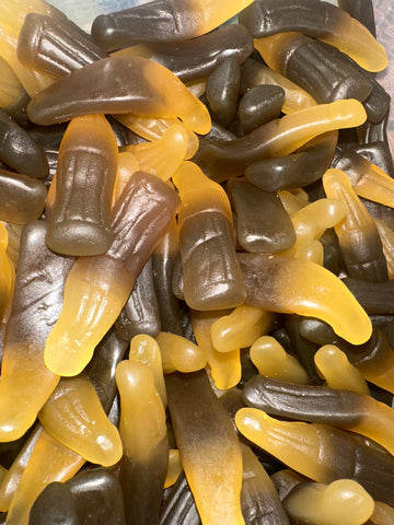 Sirop de glucose, sucre, eau, gélatine, amidon modifié de pomme de terre, acidifiants : E330, E270, agent d'enrobage : huile végétale (palme), E901, E903, arômes artificiel, colorants: E150c.